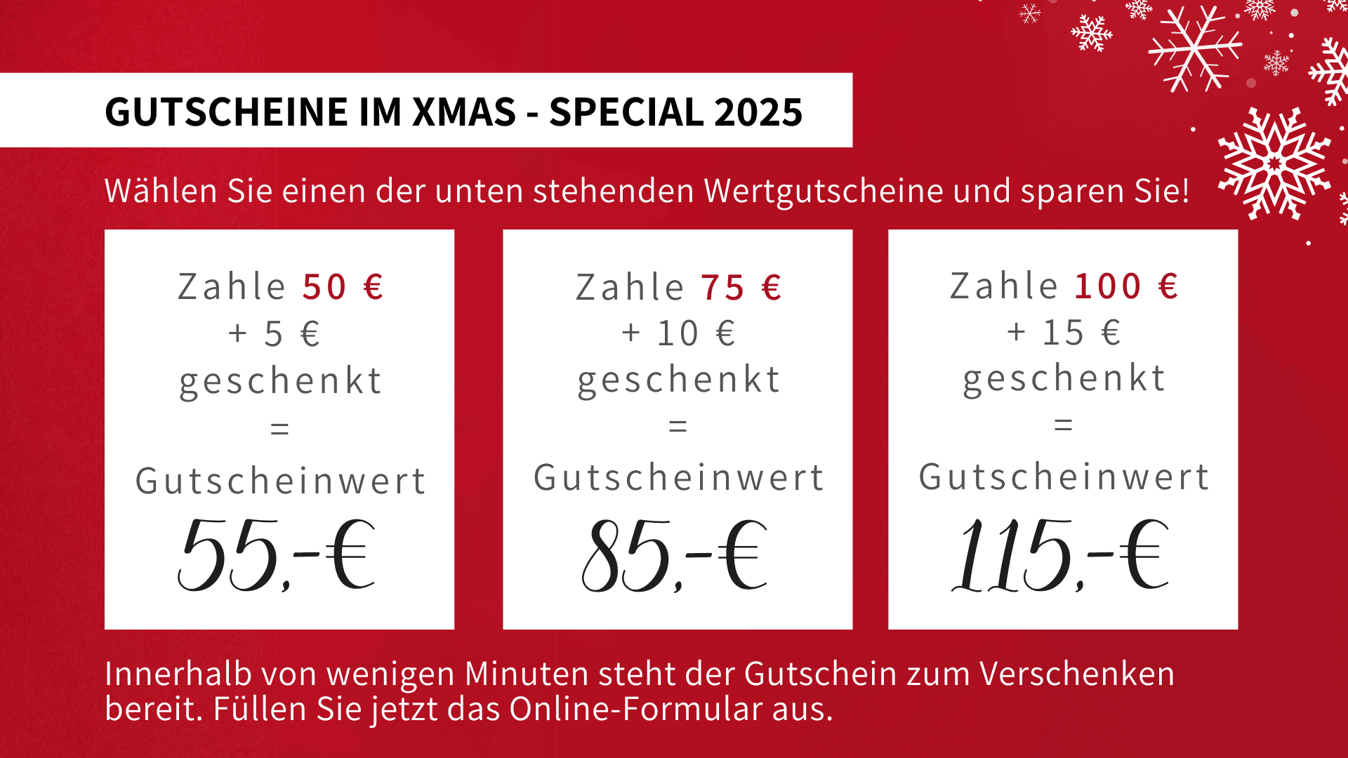Der Rabatt gilt nur bei Buchung einer der genannten 3 Optionen bis zum 24.12.2025. Alle anderen Wertgutscheine in selbstgewählter Höhe sind von den Rabatten ausgenommen.