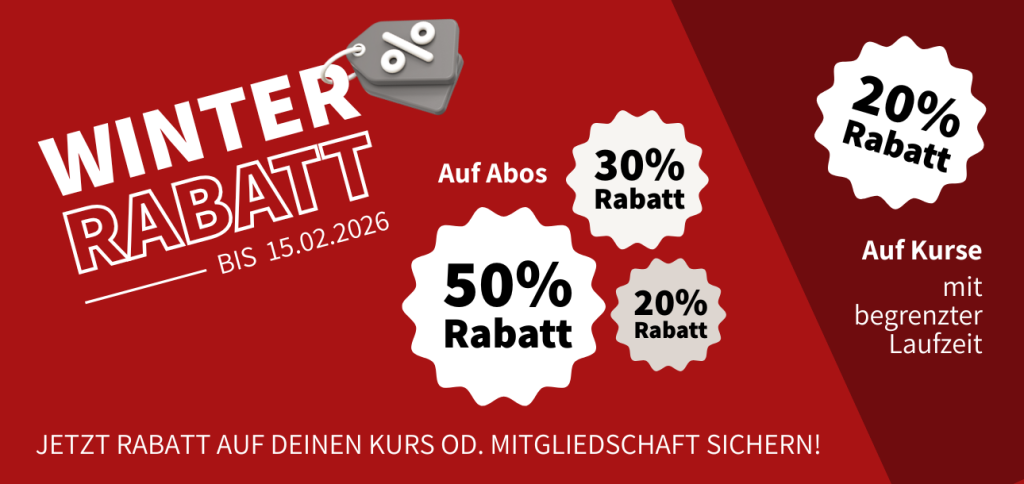 * Diese Aktion gilt nur für entsprechende Kursbuchungen und Abo-Anmeldungen, die bis zum 15. Februar 2026 bei uns eingehen (nicht für Schnupperstunden, Workshops oder Ummeldungen). Für mehr Informationen: sieh dir das Angebot auf unserer Winterrabatt Aktionsseite an.